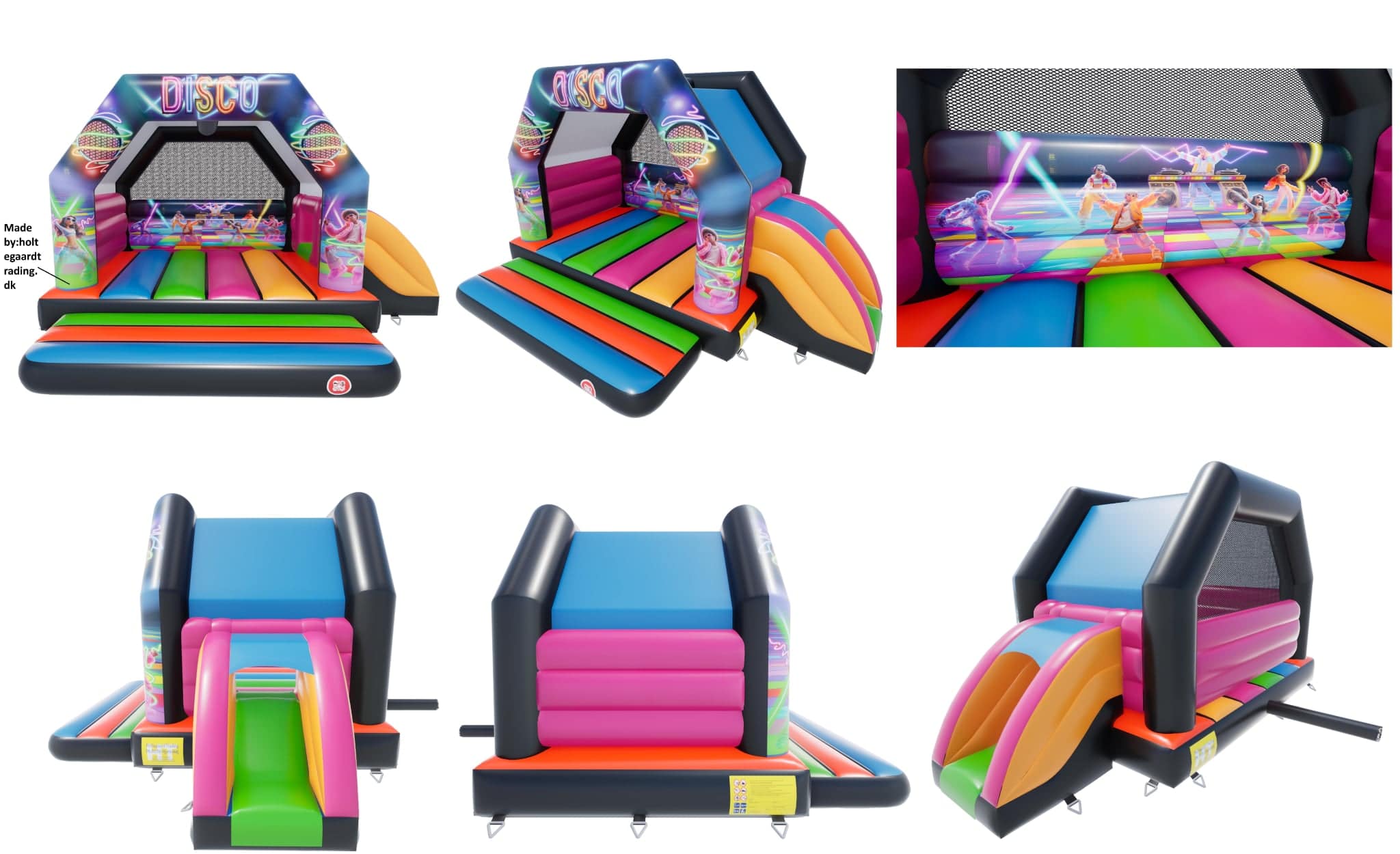 Sej ny Disco Hoppeborg fra HopNord – med farverigt disco design, slide ud af siden og overdækket tag, der beskytter mod sol og let regn.