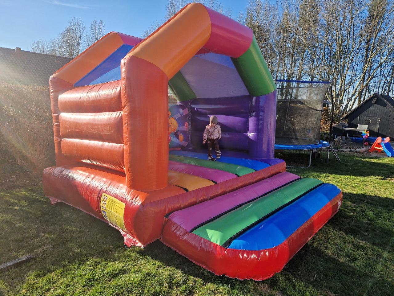 Hoppeborgen har indbygget tag, der beskytter mod let regn og sol.