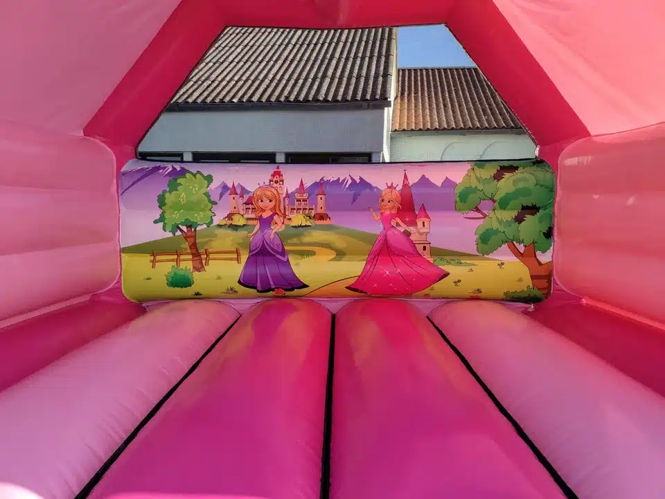 Hoppeborgen har indbygget tag, der beskytter mod let regn og sol.